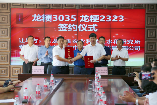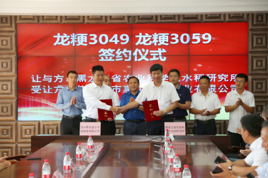 水稻研究所召开,来自黑龙江省富尔中秋农业科技发展有限公司、佳木斯惠尔农益有限公司等33家农业企业以及项目各团队科研人员140余人参加了此次观摩现场会,并举行了“龙粳3035”、“龙粳2323”和“龙粳3049”、“龙粳3059”新品种转让签约仪式。