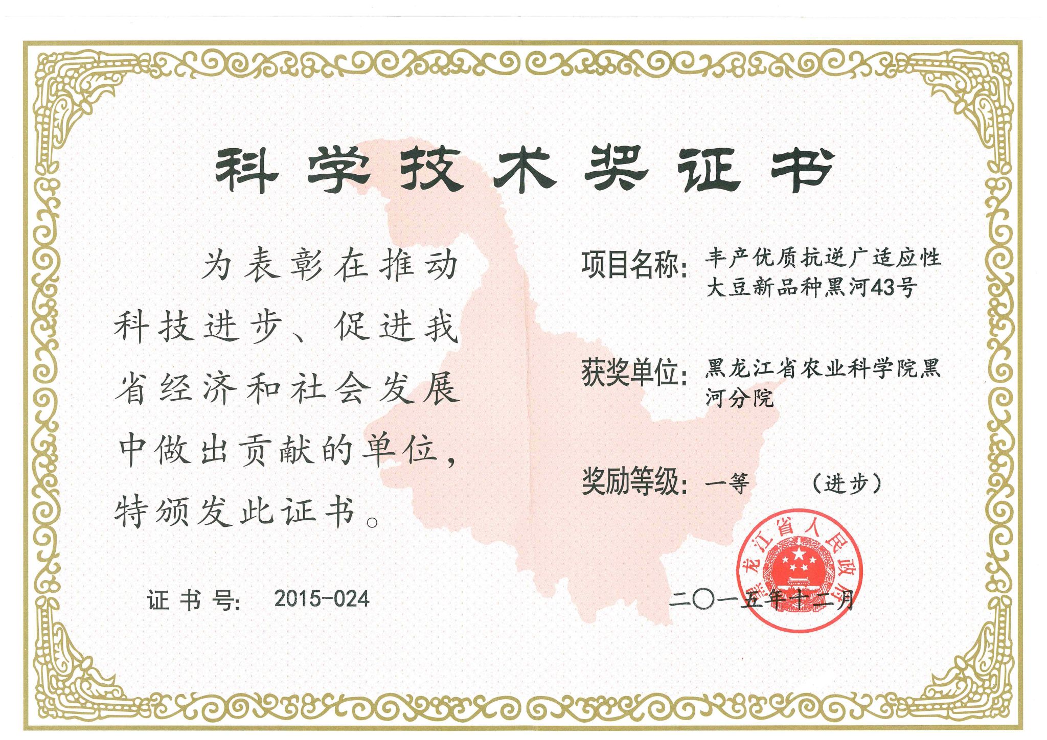 获奖情况:2015年度荣获黑龙江省政府科技进步一等奖。