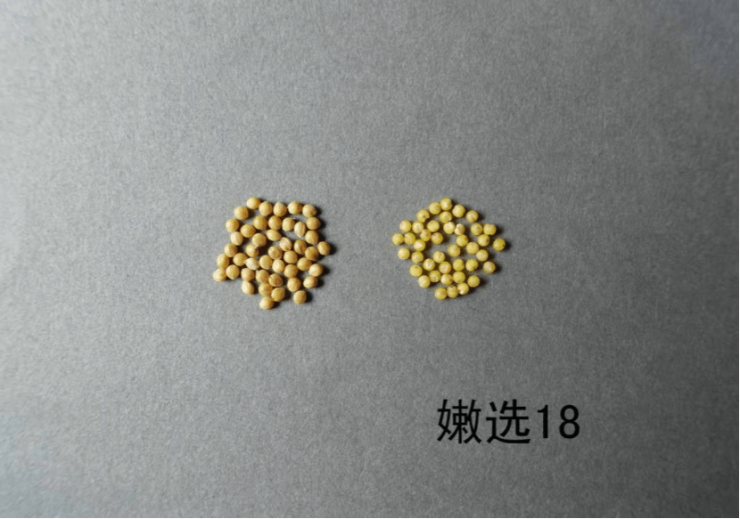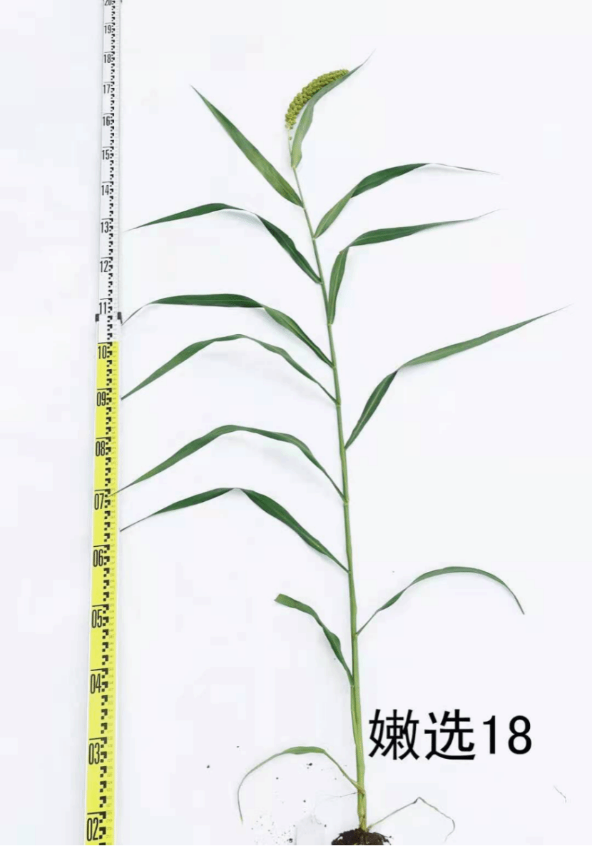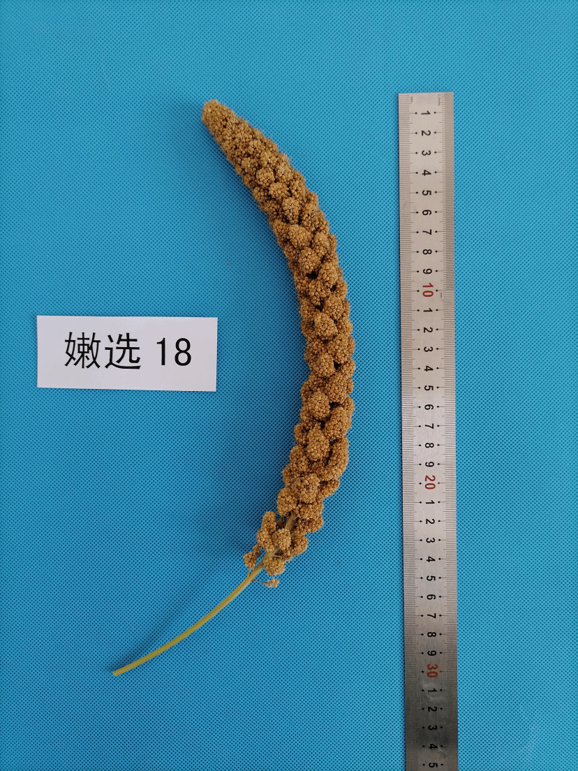 特征特性:嫩选18属粮用常规品种,不抗除草剂。生育期120 d~125 d,表现为晚熟,。幼苗叶鞘浅紫色,幼苗叶姿平展;单秆;花药白色,刚毛黄色,刚毛长度中等;平均株高152.75厘米,抗倒伏能力较强;平均穗长26.2 cm。穗型纺锤型,穗密度中到密;单穗重30.62 g,穗粒重24.5 g,抗落粒性强;千粒重3.28 g,籽粒黄色,小米中等黄色,胚乳粳型,适口性较好。