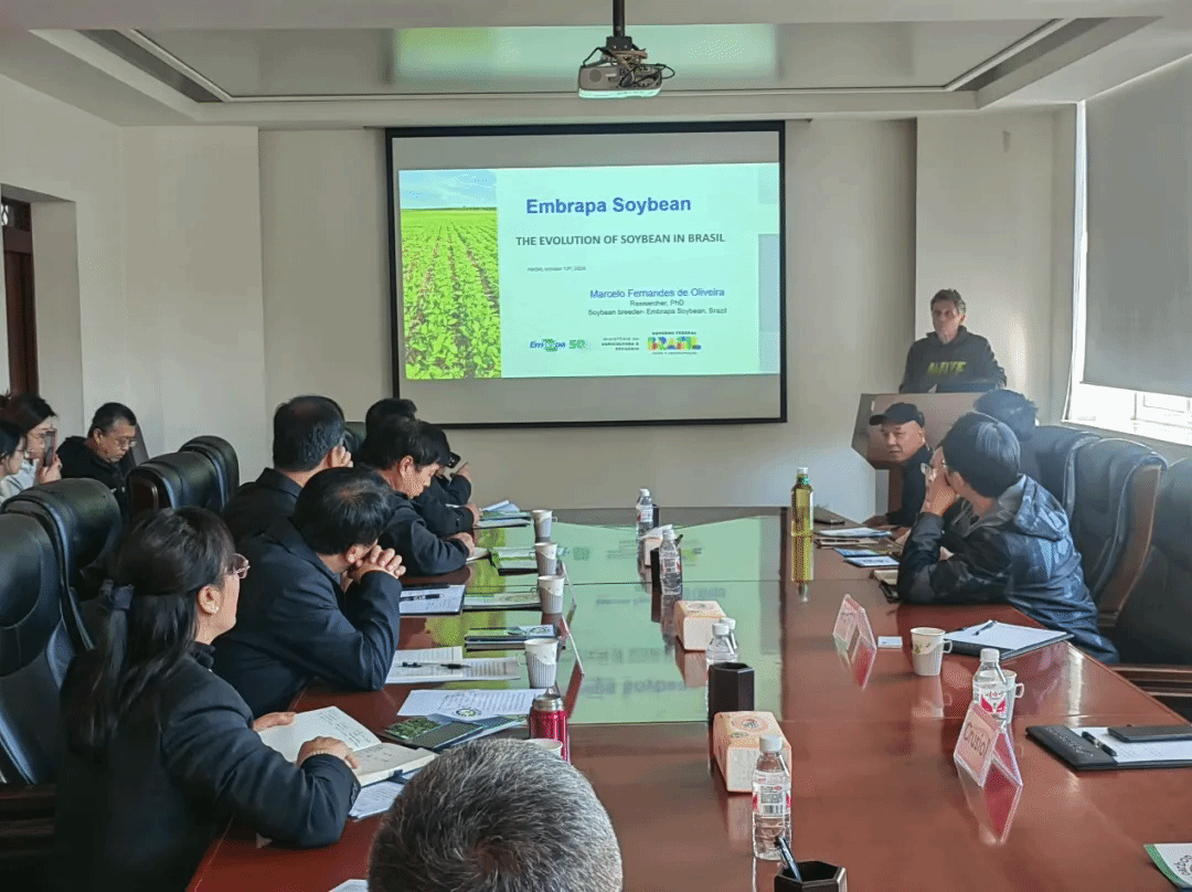 交流会上,巴西农业研究所马塞洛高级研究员详细介绍了巴西大豆产业现状,并就大豆种质资源创制、大豆种质资源表型及基因型精准鉴定技术与现场科研人员进行了深入交流。路易斯博士就如何利用遥感技术,通过图像和高光谱数据对大豆进行表型鉴定、监测长势、种植面积及品种占比、预测大豆产量等研究现状与科研人员进行了深入交流。