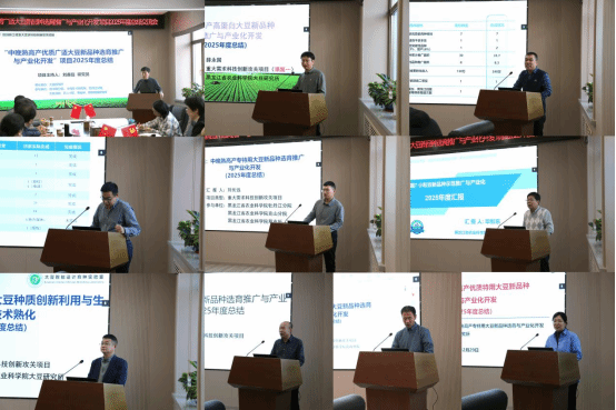 项目主持人刘鑫磊研究员代表项目团队做总体汇报,全面介绍了项目2025年度在优异育种材料创制、新品种审定推广、论文发表、成果转化、宣传报道及经费执行等方面的进展,明确了下一阶段验收准备工作的具体计划。10位课题及任务负责人依次汇报交流,大豆所会计解读了项目最新经费报销管理制度,为项目合规高效使用资金提供了政策支持。