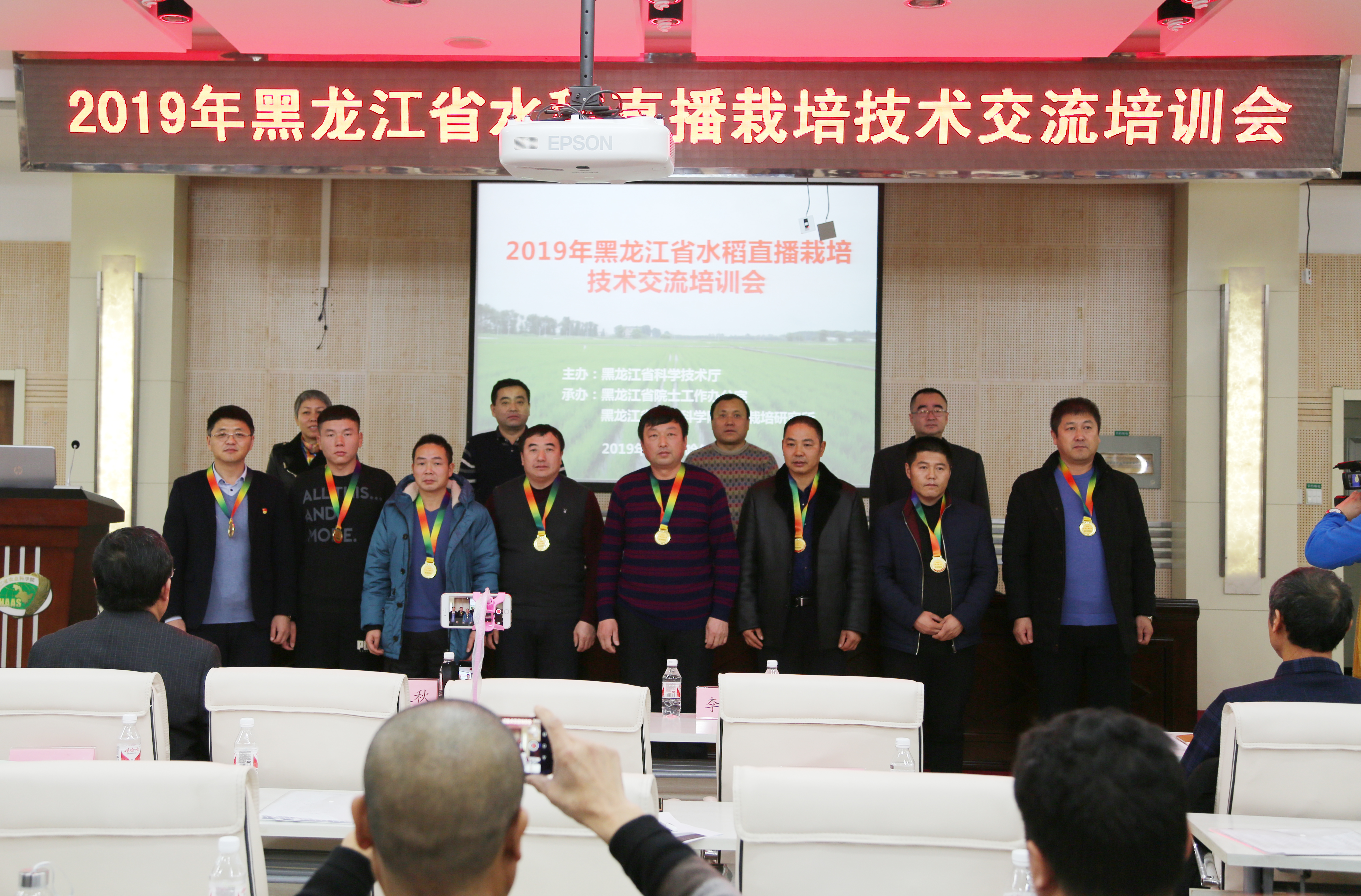 此次会议上,绥化市双河镇的种植户于春水、佳木斯市江川农场种植户李青林、同江市前进农场种植户耿忠民、饶河县红卫农场种植户郭德奎、抚远县前锋农场种植户李建军、富锦市七星农方银川、哈尔滨市巴彦县龙泉镇平泉村种植户程义秋和双鸭山市291农场种植户李万福等8人被授予了“2019水稻直播种植能手”奖章,表彰他们在我省水稻直播推广应用中做出的模范作用。