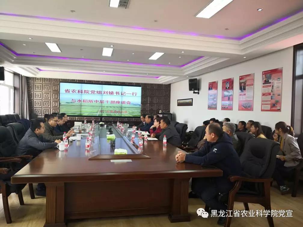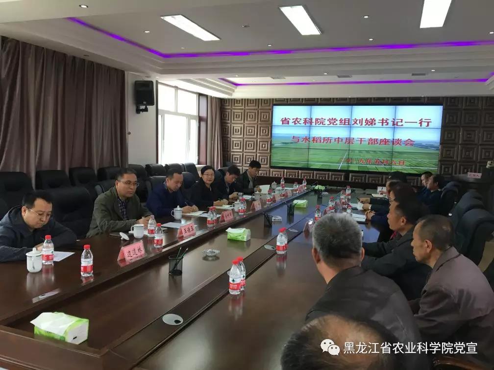 2019年5月6日上午,院党组书记刘娣带领院办公室刘述彬主任、人事处任利军处长、机关党委办公室于佰双主任、纪检监察审计处王谦玉处长、行政保卫处唐希维处长、院办公室边道林副主任一行7人到水稻所调研指导工作,并与全体中层以上干部进行了亲切座谈交流。