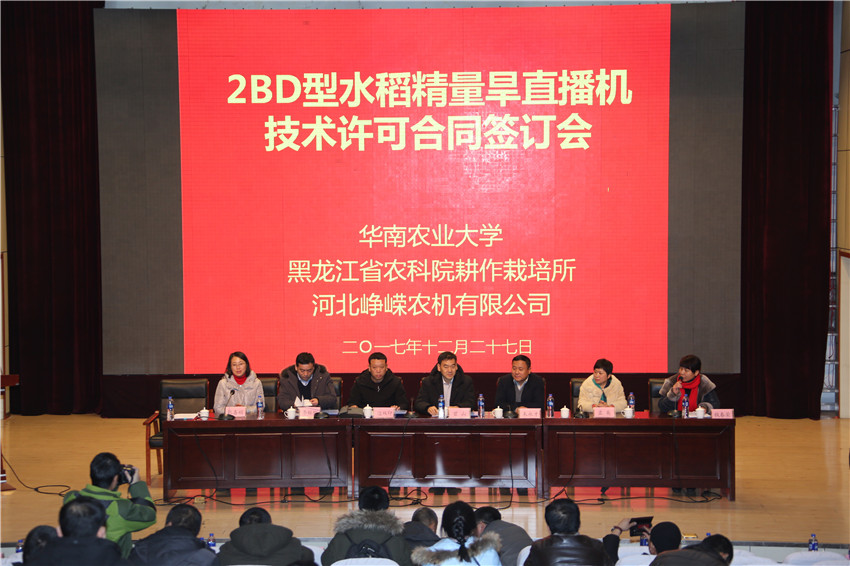 12月27日,我院耕作栽培所和华南农业大学、河北峥嵘农机有限公司就2BD型水稻精量旱直播机技术授权许可在哈签署合作协议,未来三方将共同在水稻直播机械的研发与推广中开展深层次合作,进一步发挥科技在黑龙江省农业生产中的引领和支撑作用,将科技成果快速转化为生产力,为黑龙江省水稻生产产生重要的推动作用。 华南农业大学中国工程院罗锡文院士团队曾山教授、我院耕作栽培所所长李柱刚和河北峥嵘农机有限公司边双印总经理分别代表三方在合作协议上签字。