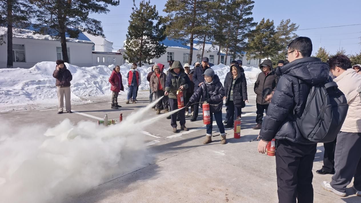 理论培训后,组织人员在黑河分院停车场开展灭火器实操演练,参训人员逐一上手操作,熟练完成“提、拔、握、压”灭火步骤,切实掌握了初期火灾扑救的关键方法。为保障演练秩序与安全,现场安排专人引导协调,确保演练流程规范、落地见效。