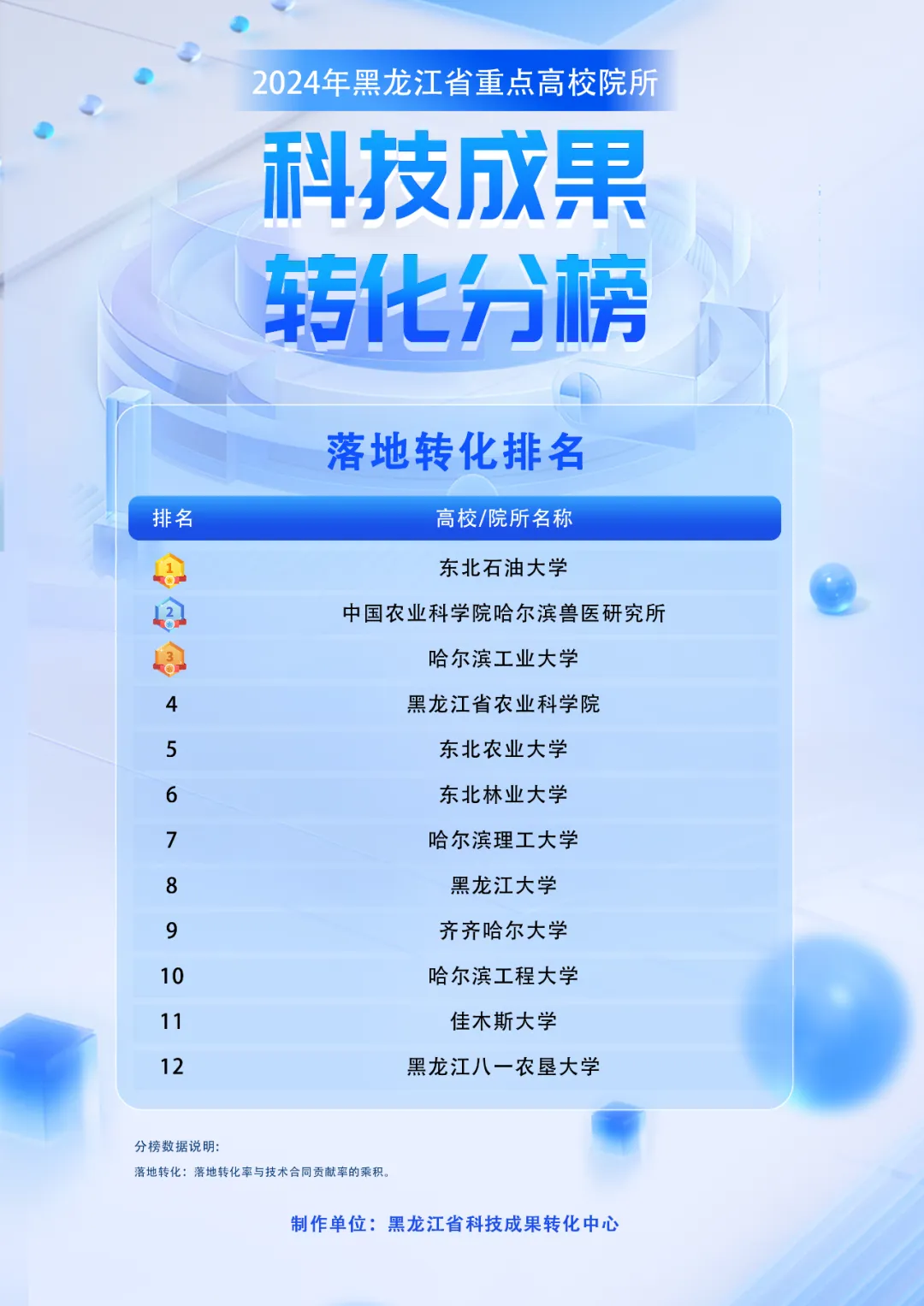 “黑龙江省高校院所科技成果转化榜”,是由省科技厅在“全省高校院所科技成果落地转化指数指标体系”基础上,对全省高校院所成果转化工作成效进行分析评价形成。“成果转化榜”由“落地转化榜、产学研合作榜、创新创业榜”三个分榜和一个总榜构成,涉及落地转化率、技术合同贡献率、技术合同成交额、年度作价入股新生成企业数量及获投融资额、企业年度营业收入等细分指标。2024年共覆盖全省50家重点高校院所,共10所高校和2所院所超过5分上榜。