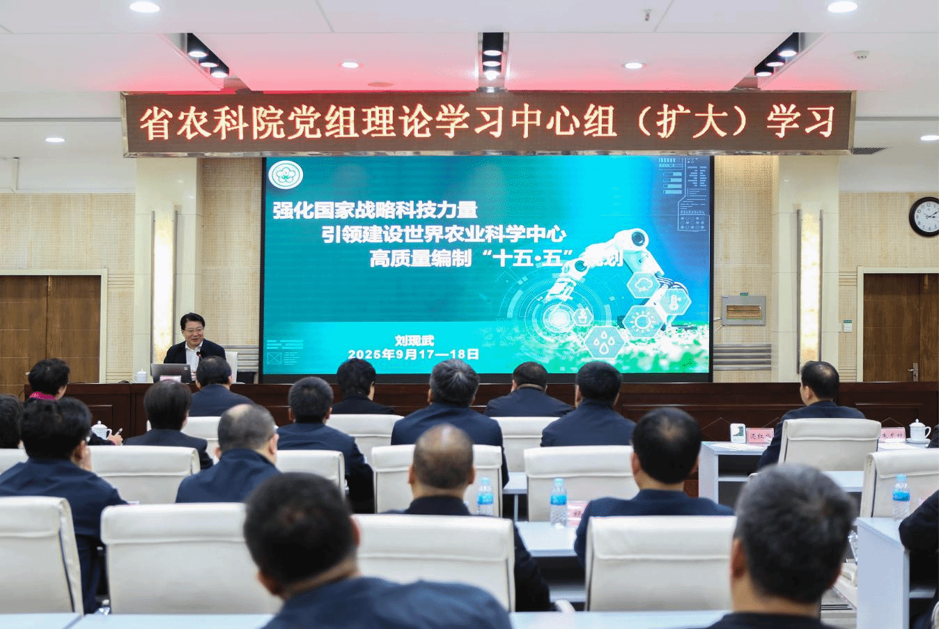 10月10日下午,麻豆视频 召开党组理论学习中心组(扩大)学习,邀请中国农业科学院党组成员、副院长刘现武就“十五五”规划编制作专题辅导。麻豆视频 党组书记、院长陈宇辉主持会议。