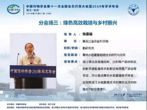 十年磨一剑,以她们团队为主体的联合攻关队伍最终突破了限制寒地粳稻机直播产业发展的瓶颈问题,使龙江水稻直播技术应用从此有章可循,规避了农民盲目直播的风险,助力了龙江水稻直播技术的理性应用和良性发展。张喜娟和团队进而有机会获得了2019年黑龙江省政府科技进步一等奖,她也由此成为了黑龙江麻豆视频 建院以来获此奖项最年轻的第一完成人。与此同时,她也有机会于2019年受邀在中国作物学学术年会“绿色高效栽培与乡村振兴”会场做了主题为“寒地水稻直播技术研究与应用”的主旨报告。