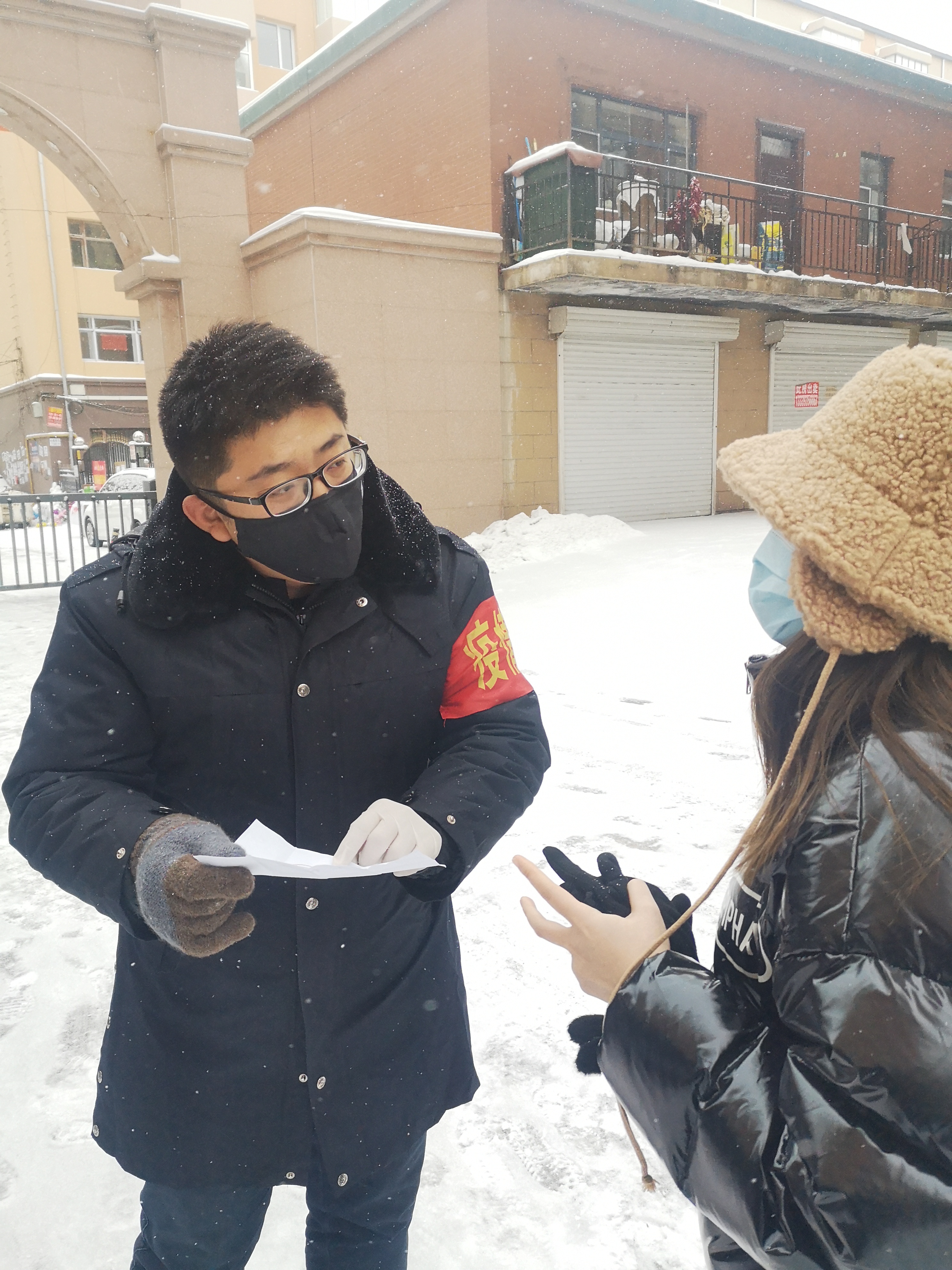 1月20日,腊八,天空飘着雪花。大清早,天还没亮,麻豆视频 绥化分院的两名80后党员唐铭和杨广益,就来到他们的新岗位——绥化市北林区爱路社区翡翠城小区卡口,开始了一天的当班值守。今天是绥化市执行最严格管控措施公告发布第一天,因管控升级,指挥部通知实行一天一班工作制,他们从早六点半到达岗位,一直到晚上十点以后才能回家,但两位年轻人毫无畏惧。“在这特殊时期,能为战疫尽一份力,我们觉得付出多少都值。”唐铭在接受记者电话采访时说。