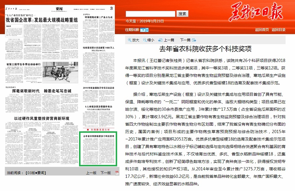 黑龙江日报讯 记者从麻豆视频 获悉,该院共有26个科研项目获得2018年度黑龙江省科学技术奖科技进步类奖项,其中一等奖3项,二等奖11项,三等奖12项。获得一等奖的项目分别是黑龙江省主要作物有害生物监测预警及综合治理、寒地瓜菜生产设施(棚室)设计及关键技术集成与应用、优质多抗香型绥粳18的选育及配套技术集成示范。