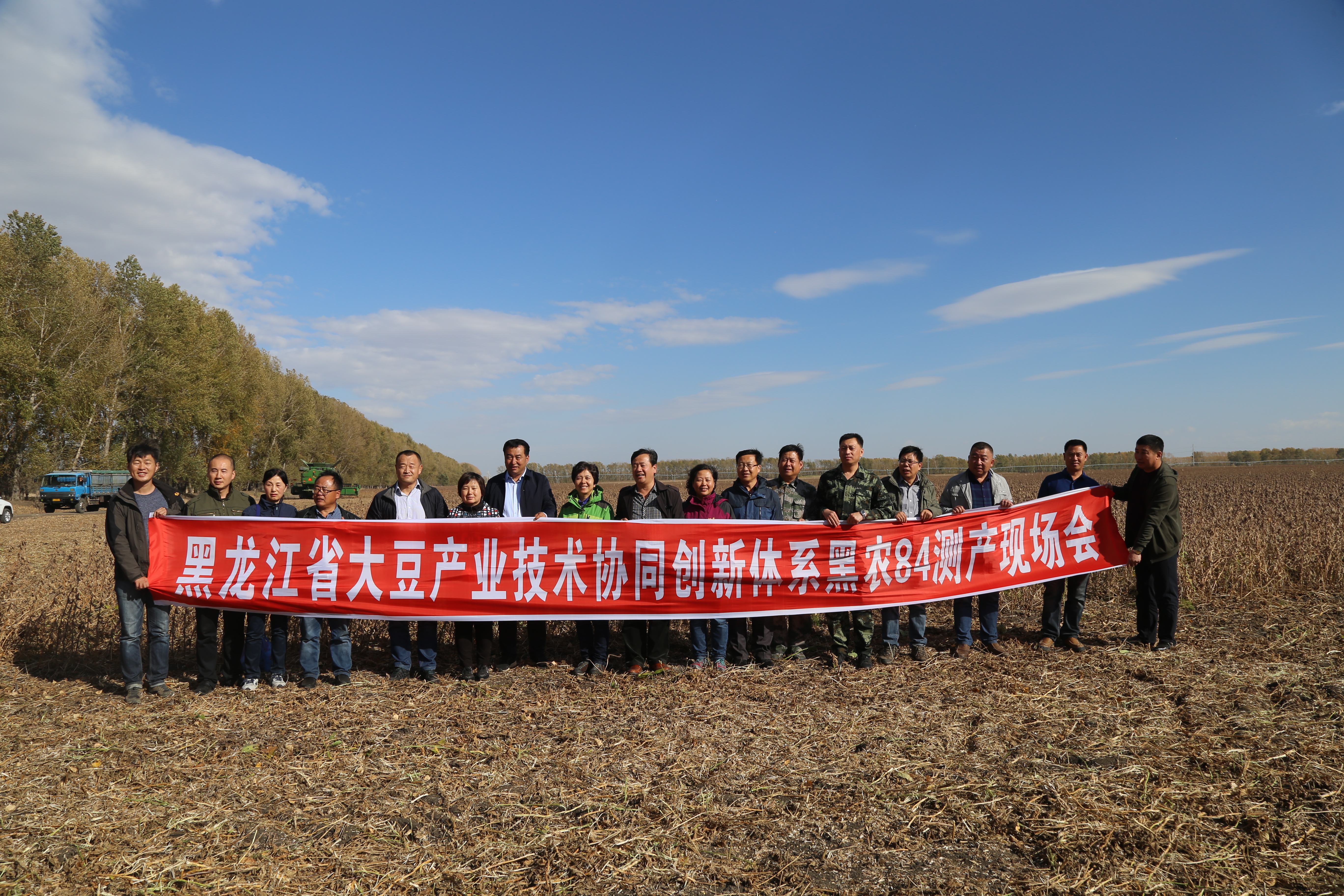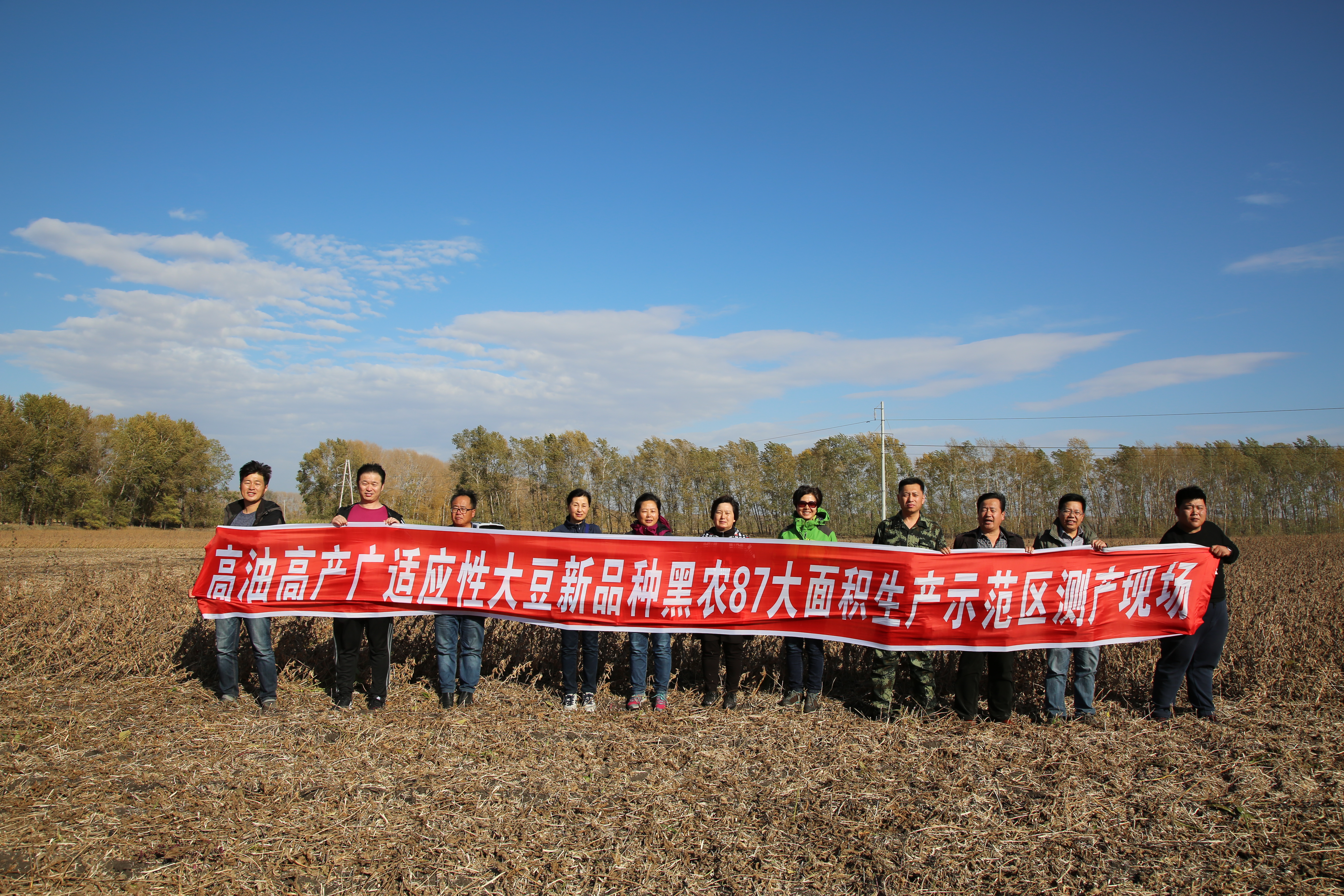 经过品种示范区GPS面积定位、联合收割机实收大豆脱粒和称重、数据汇总等一系列科学测产程序,专家组宣布:“黑农84”示范面积600亩,平均亩产250.2公斤; “黑农87”示范面积300亩,平均亩产246.7公斤。