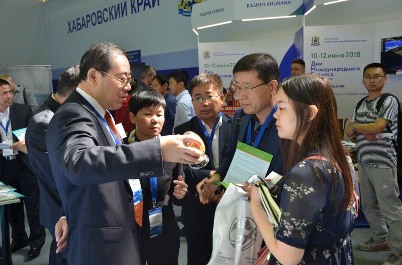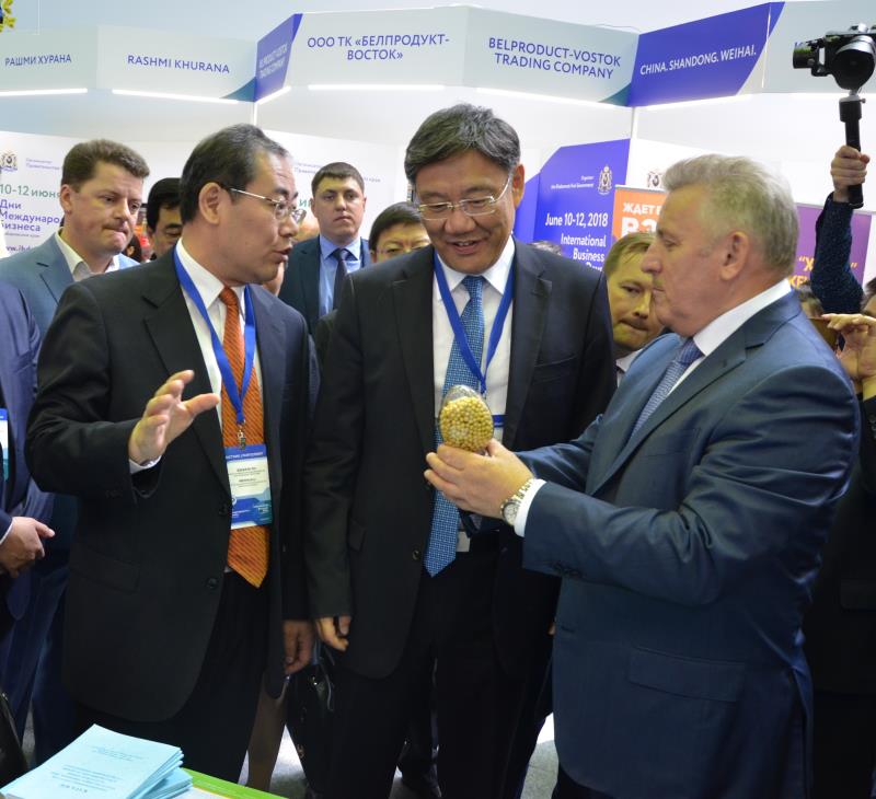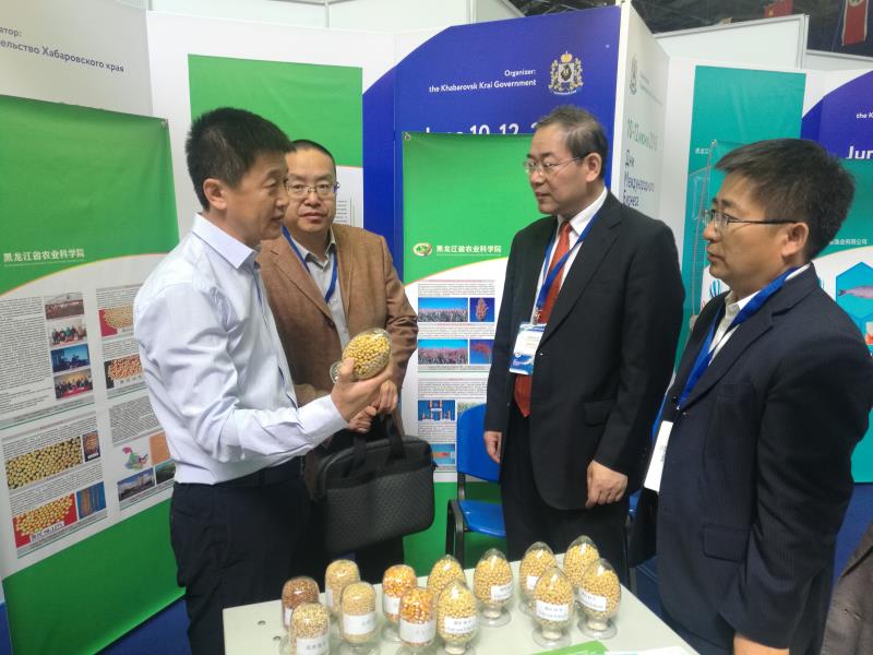 访俄期间,李文华院长参加了首届哈巴罗夫斯克边疆区“国际商务日”以及以绿色食品为主题的国际展览会“我们的选择-27”等活动。我院在“我们的选择27”展会上设置了独立展位,展示了具有自主知识产权的大豆、玉米、水稻、高粱等农作物种子样本,这些品种是我院专家精心挑选的适宜哈巴罗夫斯克边疆区、犹太自治州等远东地区生态条件的优良品种,我们还翻译了品种介绍材料,制备成中俄文小册子,全部分发给了来参观的中俄农业企业。文涛省长和哈巴罗夫斯克边疆区什波尔特州长等两国政府官员亲临展位,详细了解了我院品种特性及在俄种植情况,文涛省长要求我院帮助在俄企业解决怎么种的问题,特别是要解决轮作问题,还要指导企业遵守当地法律法规,保护好生态环境。此外,我院的展位也得到了中俄企业的极大关注,北方农业有限责任公司等多家企业专程赶到展会现场,表达了我省在俄企业对农作物新品种以及轮作技术的强烈需求,希望我院尽快建成犹太自治州分院,解决当地农业生产中的实际问题。韩国国家农业和渔业集团俄罗斯远东农业支持中心、哈巴罗夫斯克边疆区农业基金会等外方单位亦表达了合作意愿,希望我院能为其提供相关支持。