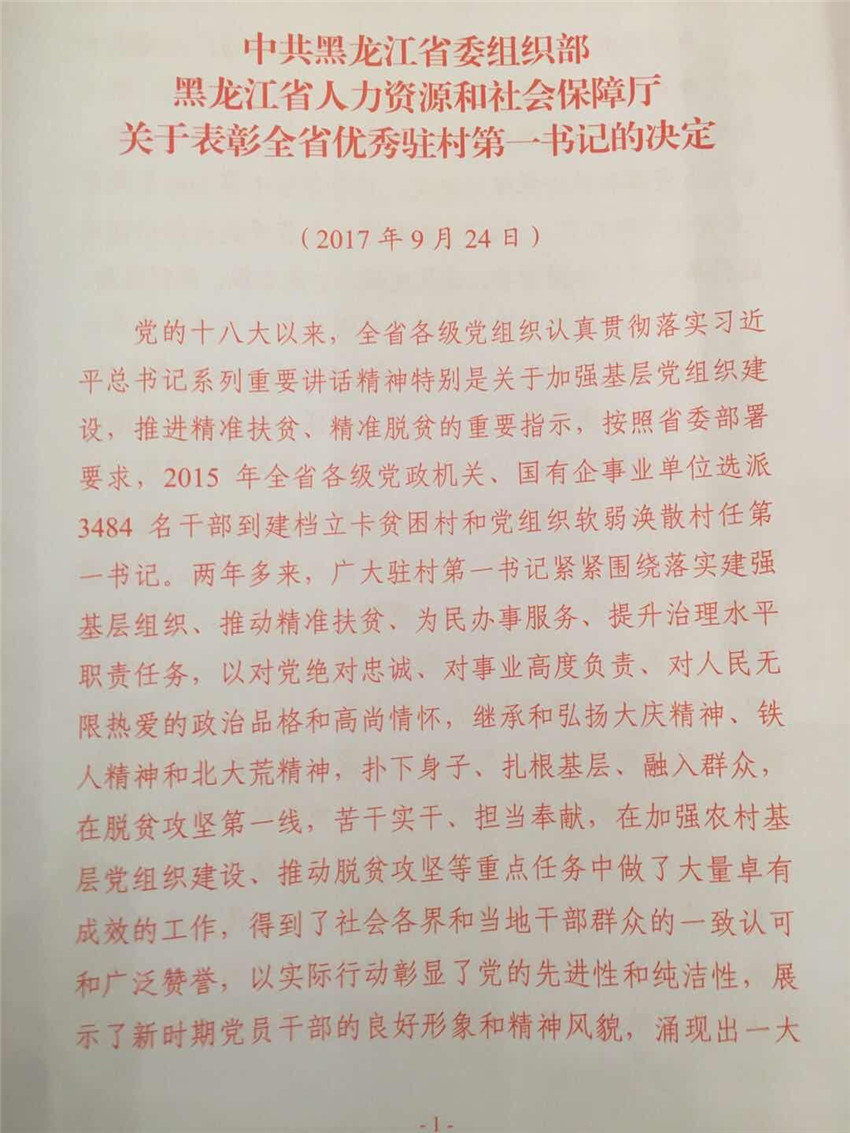 9月24日,全省抓党建促脱贫攻坚工伯会议暨优秀驻村第一书记命名表彰大会在哈尔滨召开。会议授予全省100名同志“全省优秀驻村第一书记”荣誉称号,我院第一批派驻兰西县远大乡胜利村第一书记、草业所陈积山位列其中。