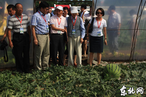 省农业科技示范园国家西甜瓜产试验站内100多斤的大西瓜,引发与会院士及专家们热议。 东北网记者 李倩摄