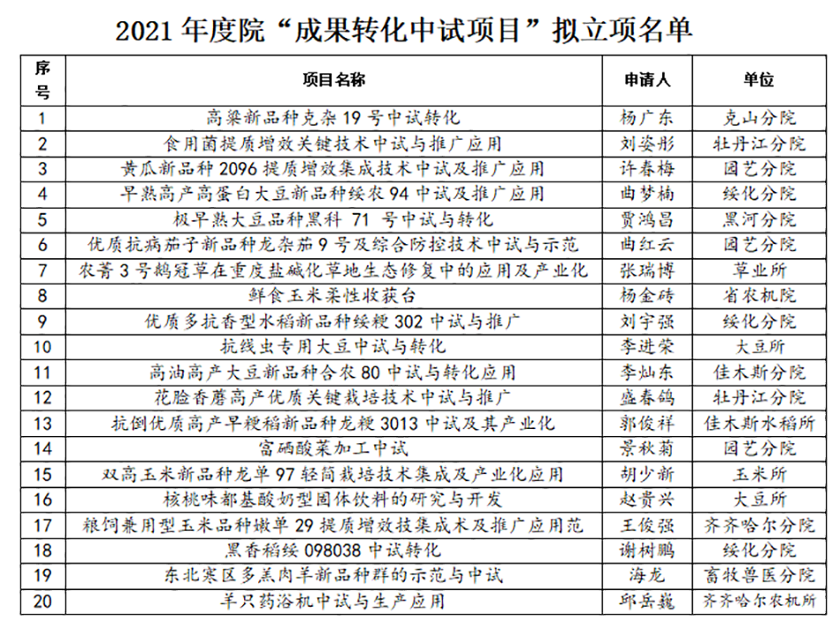 为全面落实乡村振兴战略,逐步建立以市场需求为导向的成果产出机制,引导科研人员面向科技前沿、面向经济主战场、面向国家重大需求展开科技攻关,增强我院科研人员成果转化意识,支持有苗头、有潜力、具备市场应用前景,促推产业发展的科技成果转化应用。拟确立20个项目进行立项支持。现予以公示,并就有关事项说明如下:
