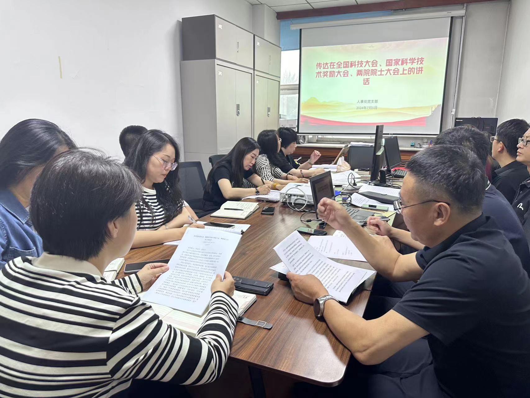 会上刘媛媛处长传达了申甲院长在全院干部大会上的讲话精神,总结了院人事处上半年工作落实情况,围绕着我院2024年重点突破性工作、党纪学习教育工作、人才队伍建设、“兴所强院”工程实施工作等方面对下半年工作进行部署。