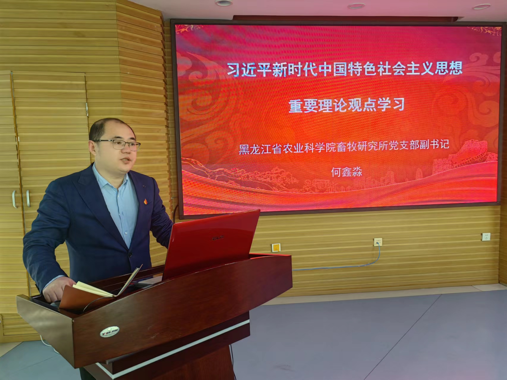 2023年4月26日,畜牧研究所党支部在所会议室召开习近平新时代中国特色社会主义思想主题教育专题党课,所支部副书记、副所长何鑫淼给全所党员做了题目为《习近平新时代中国特色社会主义思想重要理论观点学习》的主题报告。