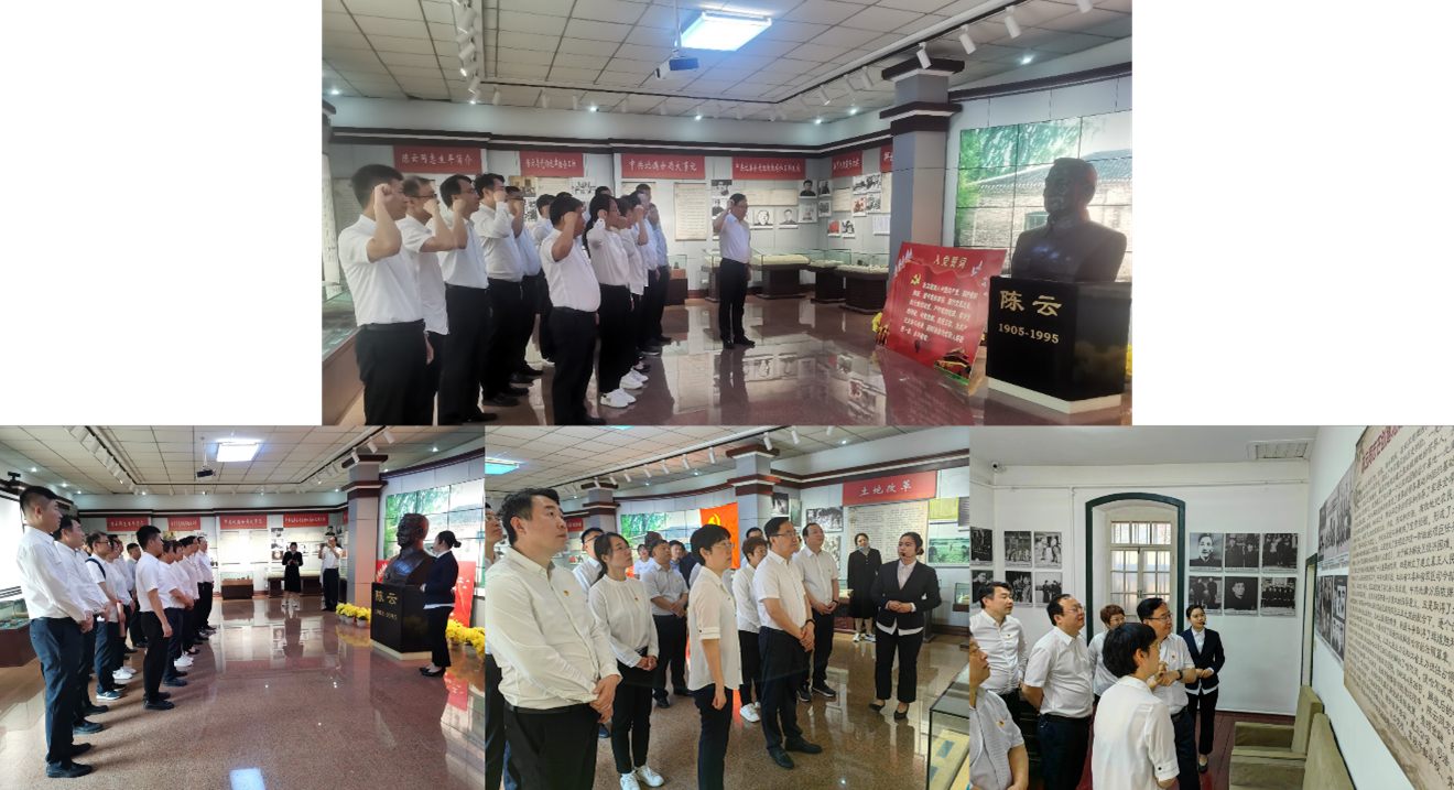 主题活动首先组织全体党员干部参观了位于宾县的陈云事迹纪念馆及故居,在讲解员的引领下,面对一件件珍贵文物,一幅幅历史图片,再次聆听陈云同志在发动群众、建立人民武装、推动土地改革等历史时期做出的重大贡献,深刻感悟陈云同志淡泊名利、对党忠诚的优秀品质。全体党员经历了一次爱国主义和革命历史教育。大家纷纷表示,要以老一辈革命家为榜样,对党忠诚,坚定信仰,解放思想,攻坚克难,扎实做好“三农”工作,全体党员面对党旗、陈云铜像重温了入党誓词。
