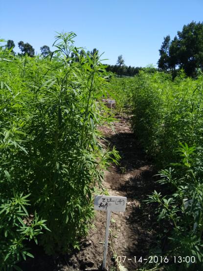 2. 建立了药用植物资源圃1处:2016年,经作所药用植物创新团队在呼兰区康金井镇农研建立药用植物资源圃1处,占地面积15亩,共搜集种植药用植物53种,含60个品种,包括柴胡类(麻柴胡,黑柴胡,黄柴胡3个品种),黄芪(绵黄芪、铁芪2个品种);桔梗(紫花和白花2种);黄芩,防风,甘草,荆芥,板蓝根,轮叶党参,藿香,鸡冠花,半夏,紫苏,灰苏,红花,瞿麦,牛夕,知母,射干,南星,蒲公英,天门冬,独活,甲酸浆,小秋葵,黄秋葵,红秋葵,远志,仓术,白术,当归,益母草,石竹花,龙葵,薏仁米,夯子,大黄,小茴香,地丁,卢巴子,急性子,杀苑子,决明子,白花菜籽,大熟季,瓜蒌,赤芍,黄精,白鲜皮,白芷,平贝母,水飞蓟(4个品种)和五味子。其中紫苏和决明子生育期较长,不适于黑龙江地区栽培。铁芪、桔梗等18种药植资源当年获得了种子,并从铁芪试验圃内筛选优良单株30株,单株测定,单株保存,下一年单行种植,筛选优系扩繁。该资源圃的建立为我所及我院开展药用植物创新及栽培、选育研究奠定了工作基础。
