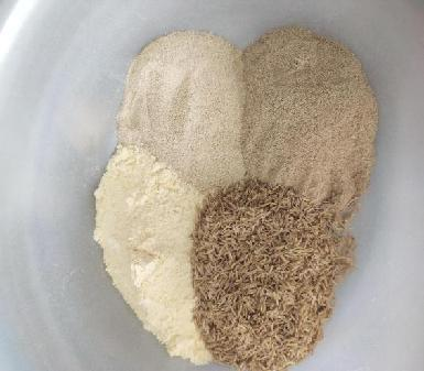 6.选择发酵饲料原料,可将米糠、玉米面、黄豆粉、酒糟等按照一定比例混合。