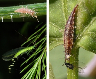 草蛉是全变态昆虫,一生中有卵、幼虫、蛹和成虫四种不同的形态。草蛉的卵,在昆虫中是较特殊的,除少数种类外,大部分的卵都有一条长长的丝柄,称“优昙华”,柄基部固定在植物的枝条、叶片、树皮等上面,而卵则高悬于丝柄的端部,因此草蛉的卵常可躲避其它昆虫的侵袭。蛹期仅约八九天。草蛉在卵期和蛹期的草蛉不能取食,捕食主要是在幼虫和成虫时期,其中尤以幼虫期捕食量大,草蛉幼虫长得丑陋,捕食凶猛,人们把幼虫期的草蛉又叫做蚜狮。蚜狮十分活跃,虽然没有翅膀,不能随意飞翔,但却能不停地在植物上爬行,到处寻找害虫捕食。草蛉的成虫食性有所变化,象中华草蛉、亚非草蛉等就改肉食性为植食性,它们象蜜蜂和蝴蝶一样,飞舞在花丛之中,吸食植物的花粉和蜜露。这时它们失去了消灭害虫的能力,而另一些种类的草蛉则坚持肉食习性,仍以害虫为食,象大草蛉、丽草蛉等,平均一天仍能吃一百多头蚜虫。