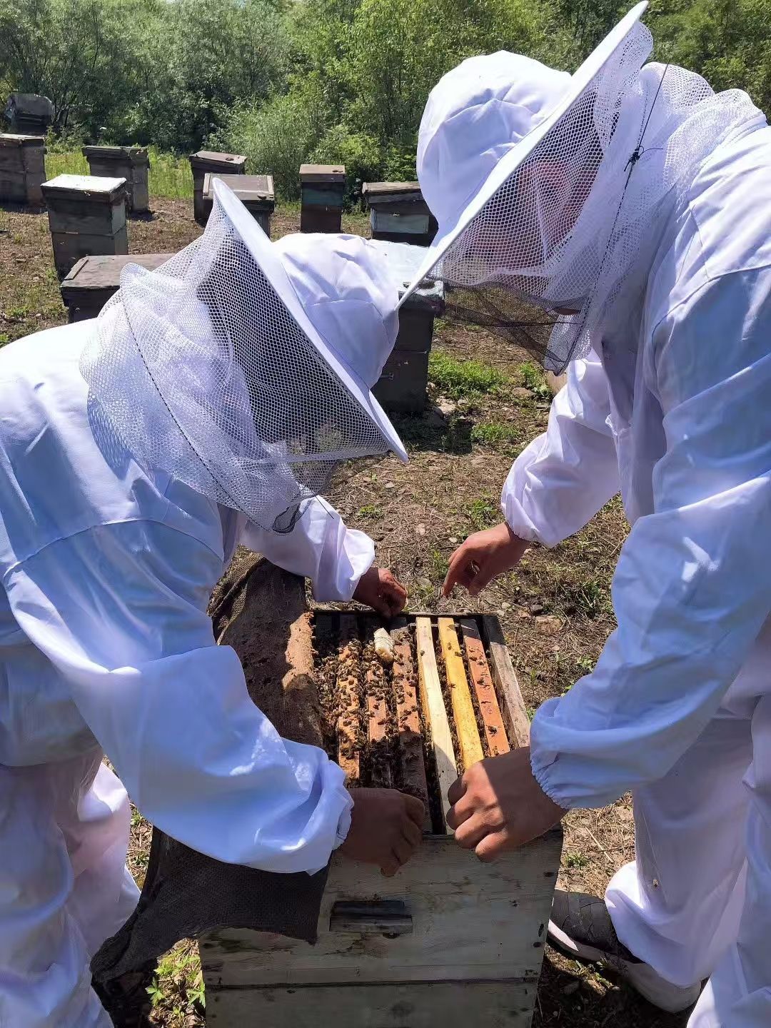 韩继程与蜂农一起查看蜜蜂生长状态