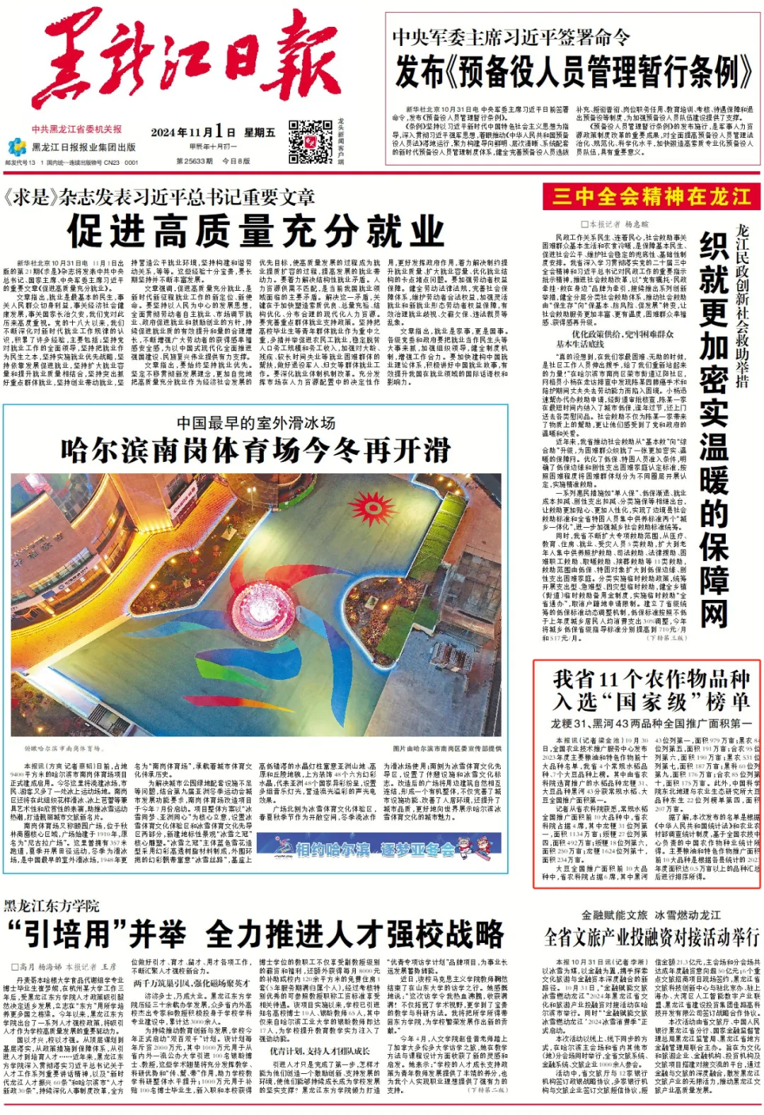 《黑龙江日报》头版:我省11个农作物品种入选“国家级”榜单 龙粳31、黑河43两品种全国推广面积第一