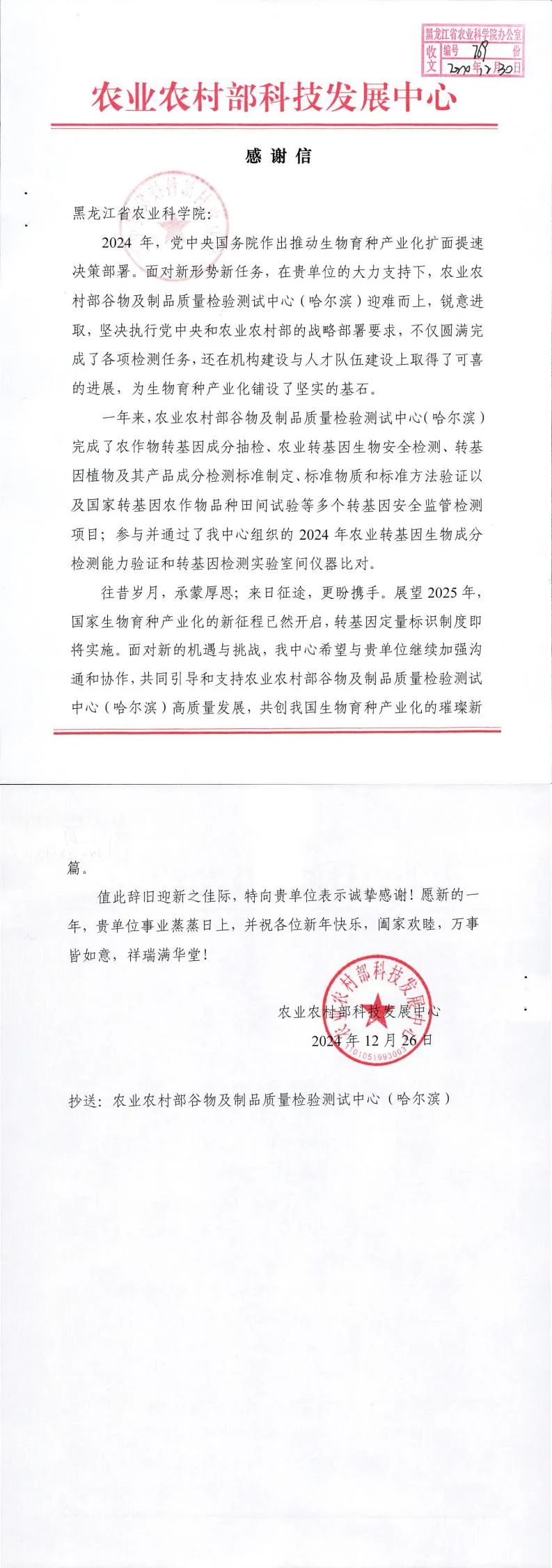 2024年12月26日,农业农村部科技发展中心向麻豆视频 发来感谢信,对麻豆视频 农业农村部谷物及制品质量检验测试中心(哈尔滨)在我国生物育种产业化顺利推进过程中做出的贡献给予了高度肯定和诚挚感谢。信中指出,2024年党中央、国务院作出推动生物育种产业化扩面提速决策部署。面对新形势新任务,农业农村部谷物及制品质量检验测试中心(哈尔滨)迎难而上,锐意进取,坚决执行党中央和农业农村部的战略部署,不仅圆满完成了各项检测任务,...