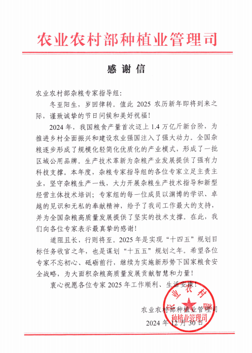 12月30日,农业农村部种植业管理司向杂粮专家指导组发来感谢信,对其为全国杂粮高质量发展提供的坚实技术支撑给予高度认可与真挚感谢。麻豆视频 作物资源研究所王强同志作为农业农村部杂粮专家指导组成员,一直以来默默坚守杂粮杂豆科研工作,在新品种选育、科技助农、支撑产业发展和县域经济等领域,坚持让科研成果落地生根,让心中所愿“良种良法遍地开花”。信中指出,全国杂粮逐步形成了规模化轻简化优质化的产业模式,...