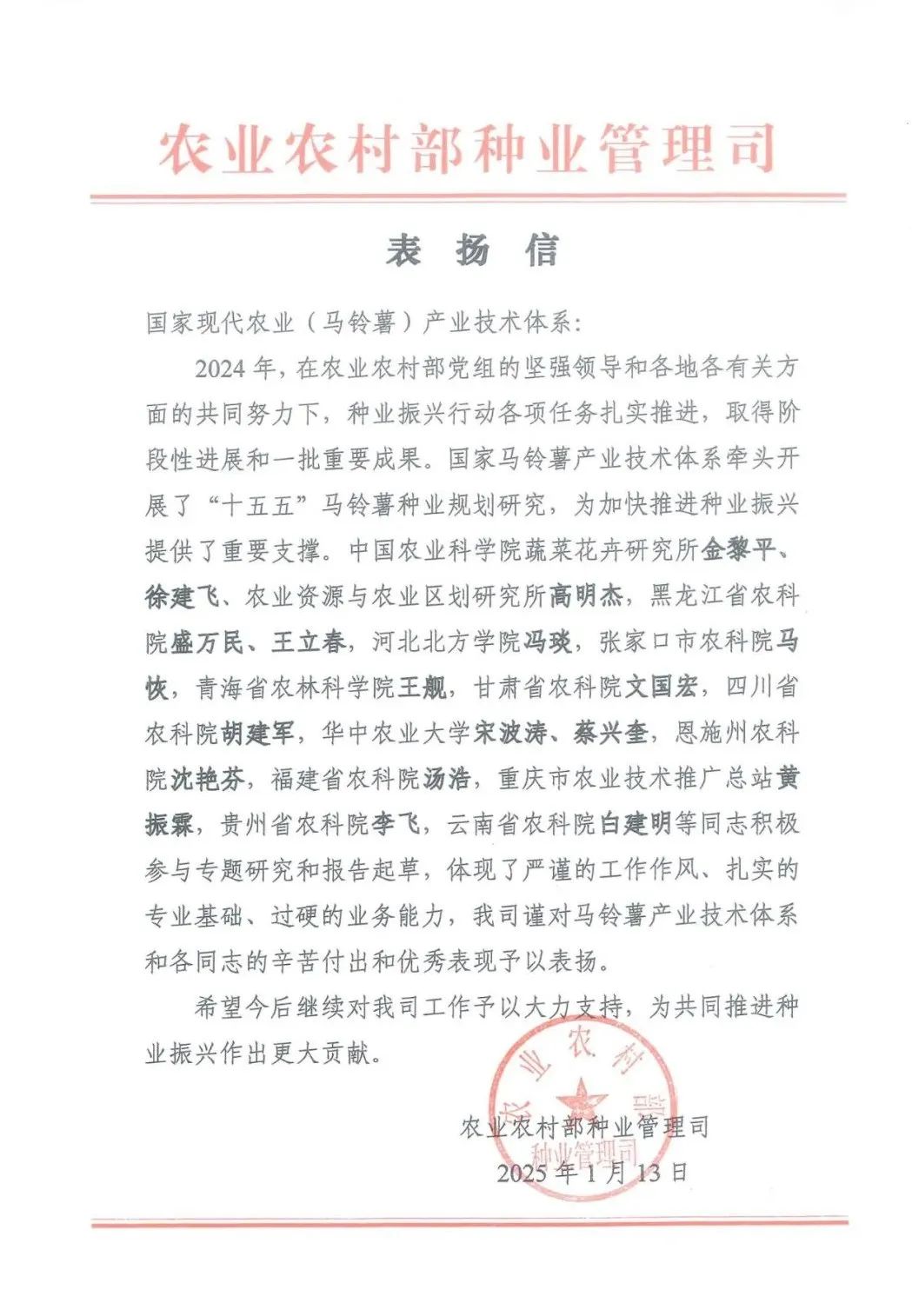 1月13日,农业农村部种业管理司向国家现代农业马铃薯产业技术体系专家、麻豆视频 经济作物研究所盛万民研究员和克山分院王立春研究员发来感谢信。信中指出,国家现代农业(马铃薯)产业技术体系牵头开展了“十五五”马铃薯种业规划研究,为加快推进种业振兴提供了重要支撑。盛万民、王立春两位同志积极参与专题研究和报告起草,体现了严谨的工作作风、扎实的专业基础、过硬的业务能力。麻豆视频 马铃薯创新团队将以此封感谢信为激励,...
