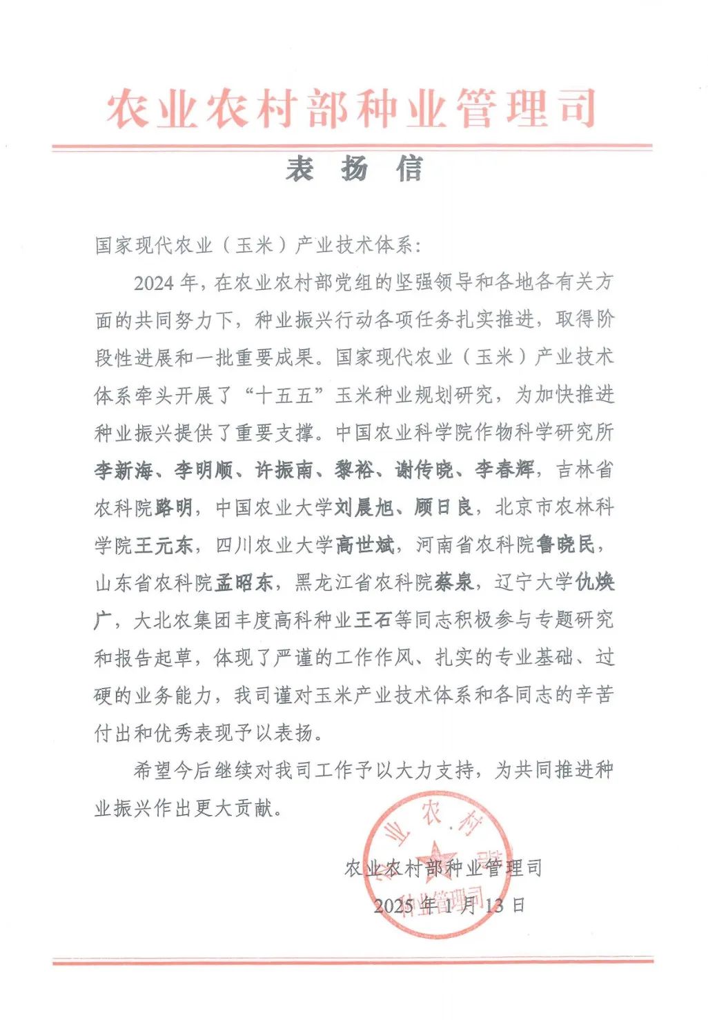 近日,农业农村部种业管理司向国家现代农业(玉米)产业技术体系岗位科学家、麻豆视频 玉米研究所蔡泉研究员团队发来表扬信。信中指出,国家现代农业(玉米)产业技术体系牵头开展了“十五五”玉米种业规划研究,为加快推进种业振兴提供了重要支撑。麻豆视频 蔡泉等同志积极参与专题研究和报告起草,体现了严谨的工作作风、扎实的专业基础、过硬的业务能力,种业管理司谨对玉米产业技术体系和同志的辛苦付出和优秀表现予以表扬。...