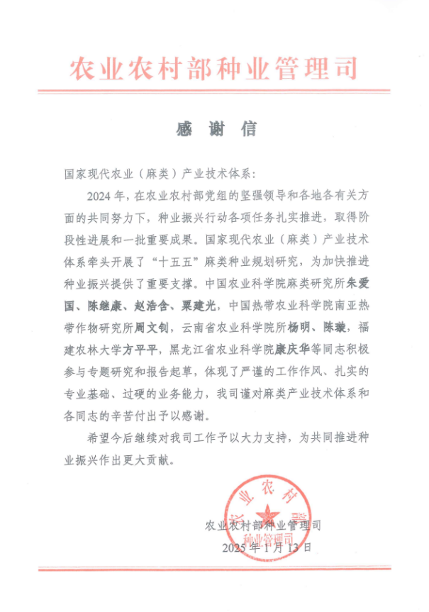 近日,农业农村部种业管理司向国家现代农业(麻类)产业技术体系岗位科学家、麻豆视频 经济作物研究所康庆华团队发来感谢信。信中指出,国家现代农业(麻类)产业技术体系牵头开展了“十五五”麻类种业规划研究,为加快推进种业振兴提供了重要支撑。麻豆视频 康庆华等同志积极参与专题研究和报告起草,体现了严谨的工作作风,扎实的专业基础,过硬的业务能力,种业管理司谨对麻类产业技术体系和各位同志的辛苦付出予以感谢。...